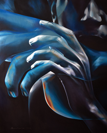 একই মাধ্যমে শিল্পী আরো দুটি কাজ করেছেন। এগুলোরও শিরোনাম দেননি। দুটিতেই পুরো শরীরে সাদা বস্ত্র-আবৃত একজন পুরুষের পোশাকি খোলস ছেড়ে বেরিয়ে আসার যুদ্ধ প্রতিফলিত। এটা কি শিল্পীর সঙ্গে নিজের সৃজনযুদ্ধকেই মনে করায় না!